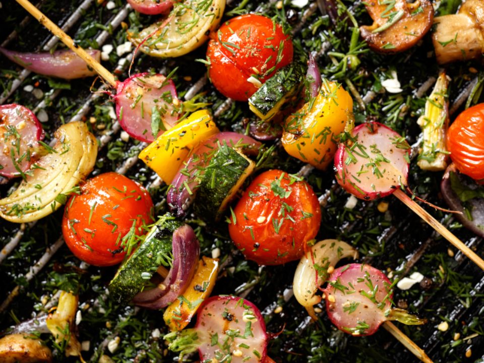 Grillgemüse am Spiess schmeckt ebenfalls, ist leicht und hat wenig Kalorien. Und schlägt man bei der Grillparty mit zu viel Fleisch über die Stränge, wäre es ideal, in den nächsten Tagen fleischlos zu essen.
