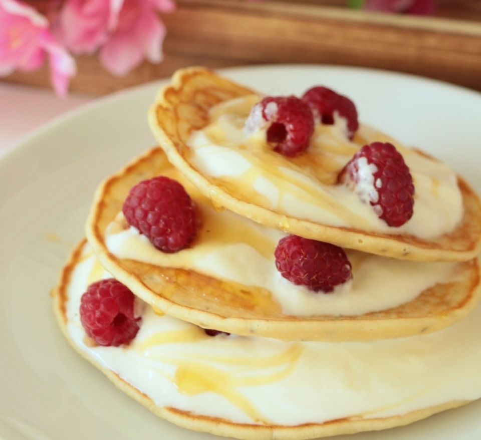 - Wenn alle Pancakes fertig sind, wird angerichtet: Einen Pancake auf den Teller geben, etwas griechischen Joghurt und Beeren darauf geben und mit Honig beträufeln. Schicht um Schicht so weiter machen