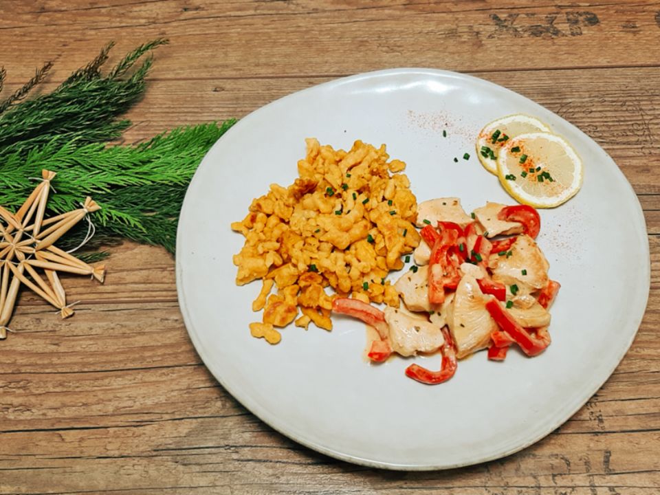 Hauptspeise - Kürbisspätzli mit Poulet Stroganoff (Pouletgeschnetzeltes)