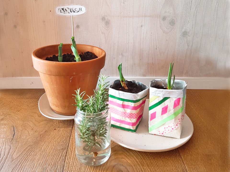 Damit das Gärtnern in Corona-Zeiten trotzdem zum Erfolg wird, haben wir einige Gemüsepflanzen aus Gemüseresten und Kräuter in Gläsern, Schüsseln und Recyclingmaterial (z.B. Eierkartons, Getränkekartons oder Klopapierrollen) auf der Fensterbank selbst gezogen.