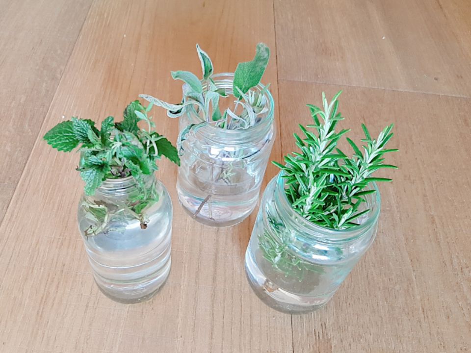 Materialien: Kräuterstängel, Konfigläser, Wasser.