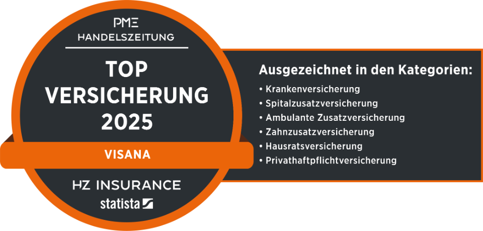 Visana gehört zu den besten Versicherungen der Schweiz. Die Handelszeitung und PME haben Visana als Top-Versicherung 2025 ausgezeichnet – und das in sechs Kategorien: Krankenversicherung, Spitalzusatzversicherung, ambulante Zusatzversicherung, Zahnzusatzversicherung, Hausratsversicherung und Privathaftpflichtversicherung. Diese Auszeichnung bestätigt unseren hohen Anspruch an Qualität und Service.