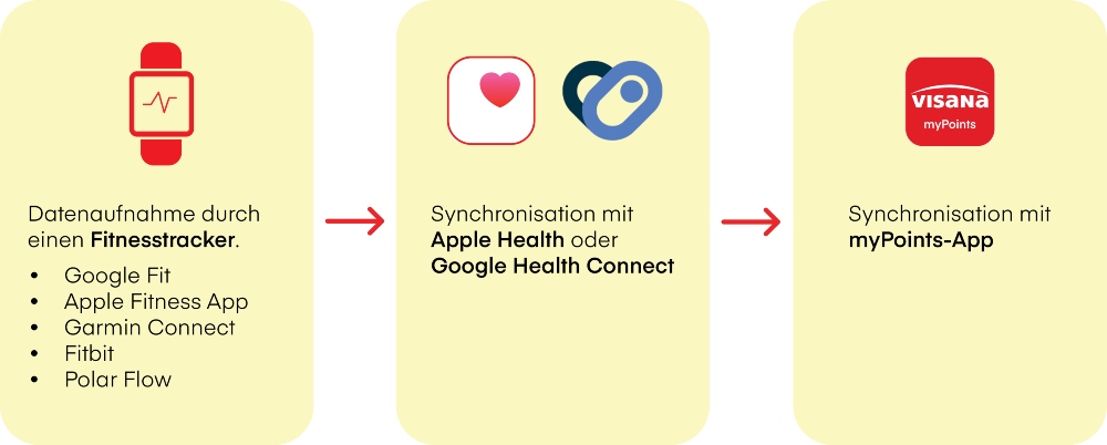 Google Fit wird zukünftig nicht mehr von der Visana-App unterstützt. Damit Sie weiterhin Ihre Fitness-Daten nutzen können, benötigen Sie Google Health Connect. Durch die Verbindung Ihrer Daten mit Google Health können diese problemlos in unsere neue myPoints App übernommen und synchronisiert werden.