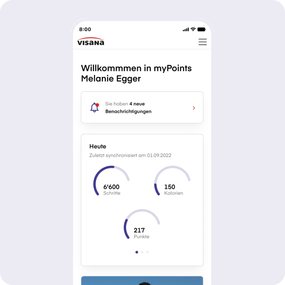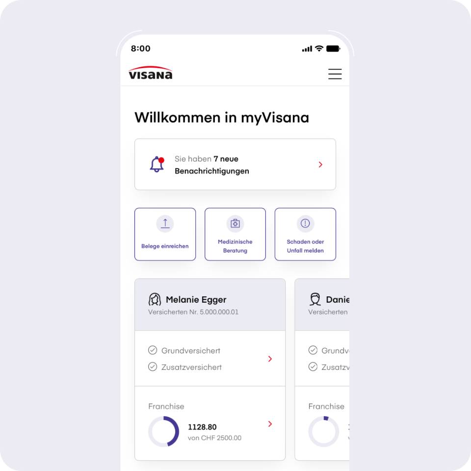 Visana unterstützt mich und meine Familie in allen Bereichen. Kompetente und freundliche Hilfestellung bei Fragen, exzellenter kundenorientierter Service bei Spitalaufenthalten sowie rasche Begleichung bei Leistungsabrechnungen zeichnen Visana aus. Dass ich dank «myPoints» meine sportlichen Leistungen aufzeichnen und mich in verschiedenen Challenges immer wieder herausfordern darf, ist Motivation pur. Ausserdem habe ich in der praktischen Visana-App alles immer beieinander: die Versichertenkarten der gesamten Familie, ärztliche Beratung per Chat sowie die Gesamtübersicht über mein Bonusprogramm.