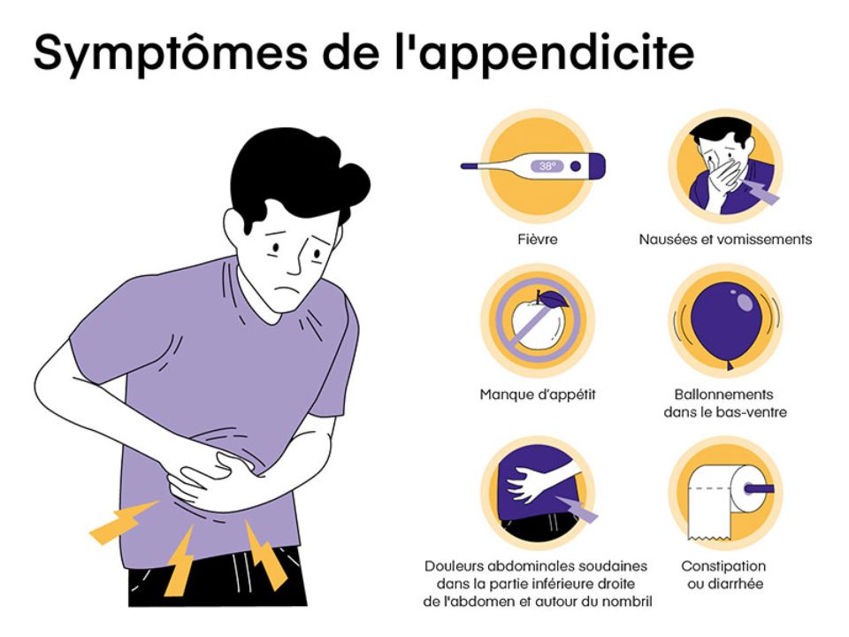Important: si vous suspectez une appendicite, rendez-vous toujours immédiatement aux urgences. Si vous êtes jeune, que vous avez encore votre appendice et que vous ressentez des douleurs dans la partie inférieure droite de votre abdomen (éventuellement avec de la fièvre), n'hésitez pas!