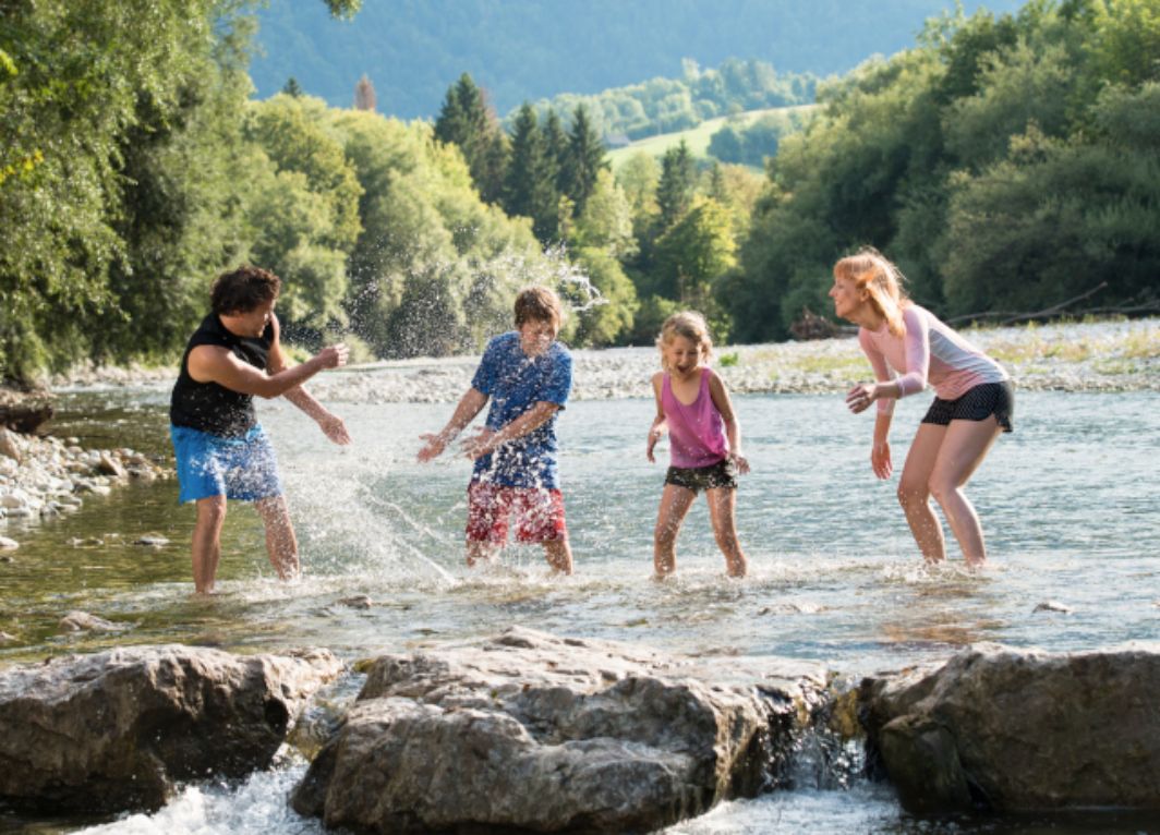 Les ruisseaux, rivières et lacs invitent également petits et grands à l’aventure, au divertissement et à la détente. Les enfants n’ont pas besoin de beaucoup pour découvrir les abords des cours d’eau et des lacs. Le rivage offre une foule d’idées de jeux: faire des ricochets (faire rebondir un caillou plat sur la surface de l’eau), collecter des cailloux, observer les petits poissons, construire des maisons en pierres ou des châteaux de sable.