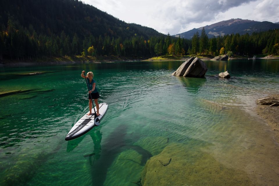 Désirez-vous vivre une atmosphère de conte de fée tout en vous déplaçant sur l’eau? Le lac de Cauma dans les Grisons est exactement l’endroit idéal pour pratiquer le SUP. L’eau turquoise et la forêt d’un vert profond qui l’entoure en font un lieu tout à fait unique. En été, le lac est une destination prisée pour une excursion; au printemps ou en automne, il est moins fréquenté. Le lac de Cauma n’est pas accessible en voiture: 15 à 20 minutes de marche séparent le parking du lac. C’est pourquoi nous vous recommandons d’emporter une planche gonflable dans le sac à dos.
