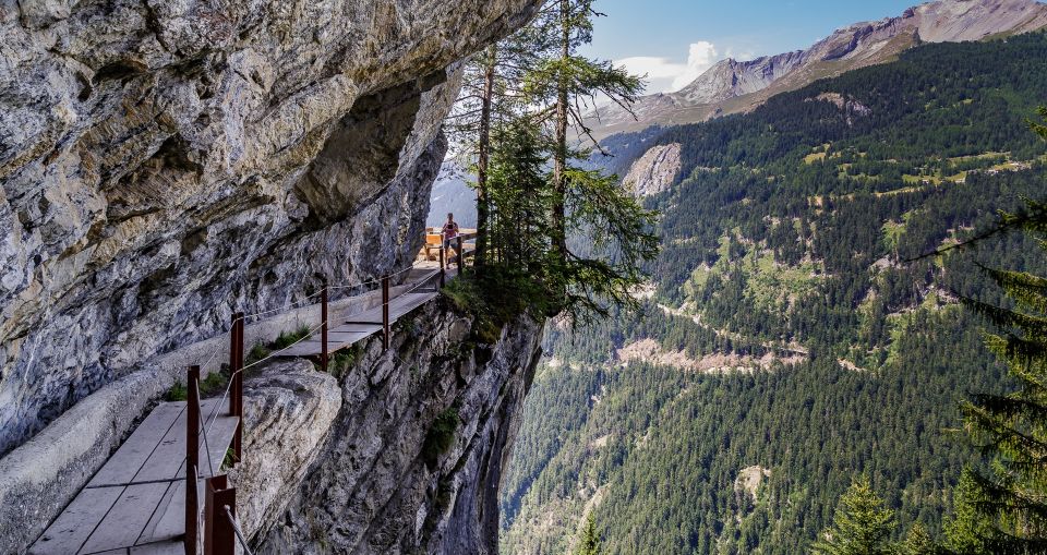 Pour cette randonnée, il ne faut pas avoir le vertige. Le parcours débute près du lac de Tseuzier dans la région de Crans-Montana. L'arrivée en car postal est déjà un spectacle en soi, en raison de l'étroitesse des routes. De là, le sentier de randonnée prend la direction de Crans-Montana. Le Bisse du Ro commence peu après «La Comalire». Ces canaux historiques jouissent d'une longue tradition dans le Valais; aujourd'hui, il est possible de découvrir une bonne partie d'entre eux en empruntant les chemins qui les longent. Le Bisse du Ro a été canalisé dans des conduites souterraines dès le milieu du 20e siècle. La randonnée qui longe l'ancien cours d'eau est une véritable aventure et permet de découvrir de manière impressionnante la construction qui a irrigué le versant sud et nécessité une bonne dose de témérité. Frissons garantis lors de cette randonnée d'environ trois heures.