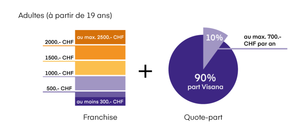 La loi prescrit que les personnes disposant de l'assurance de base en Suisse doivent participer à leur frais de santé. Ce montant est appelé participation aux coûts. Elle est constituée d’un montant annuel fixe, la franchise, et d’une quote-part.