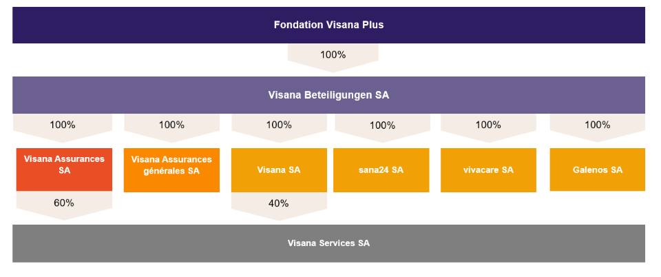 La société de participation possède 100% du capital-actions de Visana SA, Visana Assurances SA, Visana Assurances générales SA, sana24 SA, vivacare SA et Galenos SA. Visana Beteiligungen SA peut détenir des participations de toute sorte. Elle n'exerce aucune activité opérationnelle.