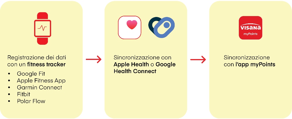 In un primo momento Apple Health e altri tracker continueranno a essere disponibili nella versione attuale di Visana App e saranno integrati nella nuova app myPoints in un momento successivo.