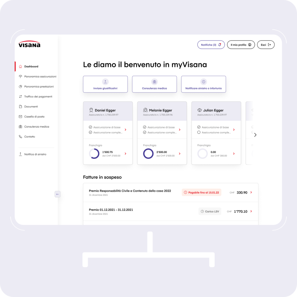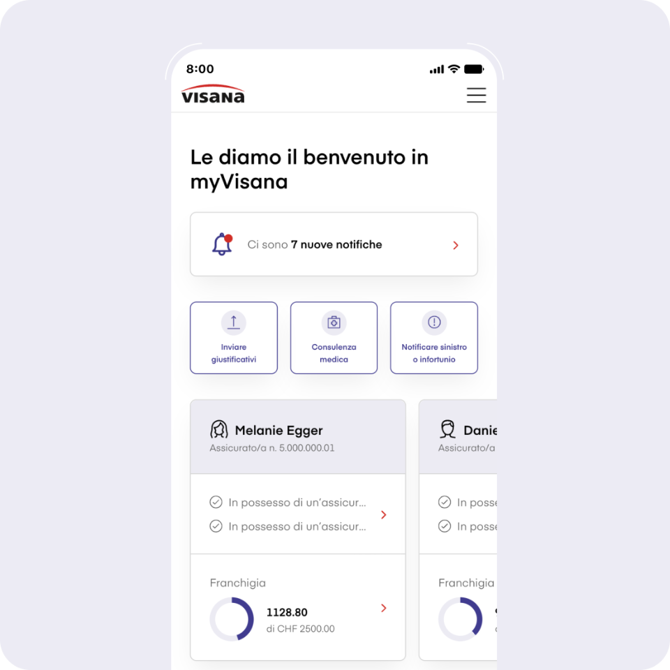 Grazie a myVisana potete gestire tutto ciò che riguarda la vostra assicurazione quando e dove volete. Sul computer, in semplicità e comodità. O con l’app sullo smartphone.